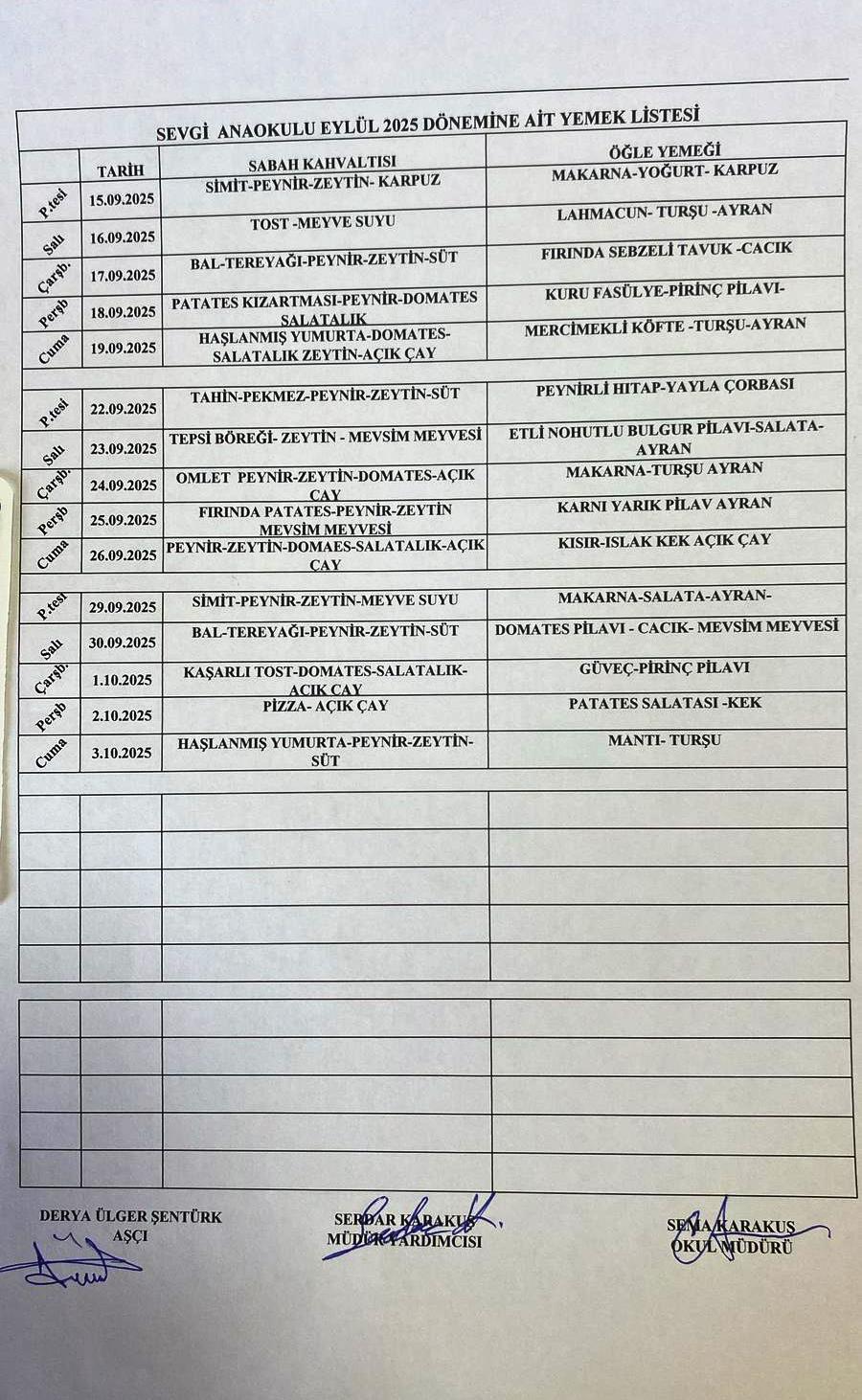 EYLÜL AYI YEMEK LİSTESİ